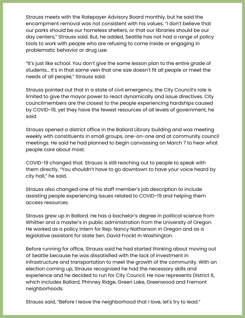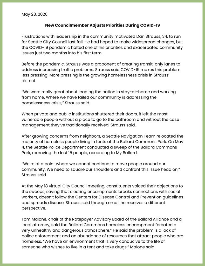 In my Journalism class at WWU, I honed my interviewing and writing skills. For a news article assignment I conducted an interview with a newly-elected Seattle City Council member about controversial police sweeps of homeless camps in Seattle.